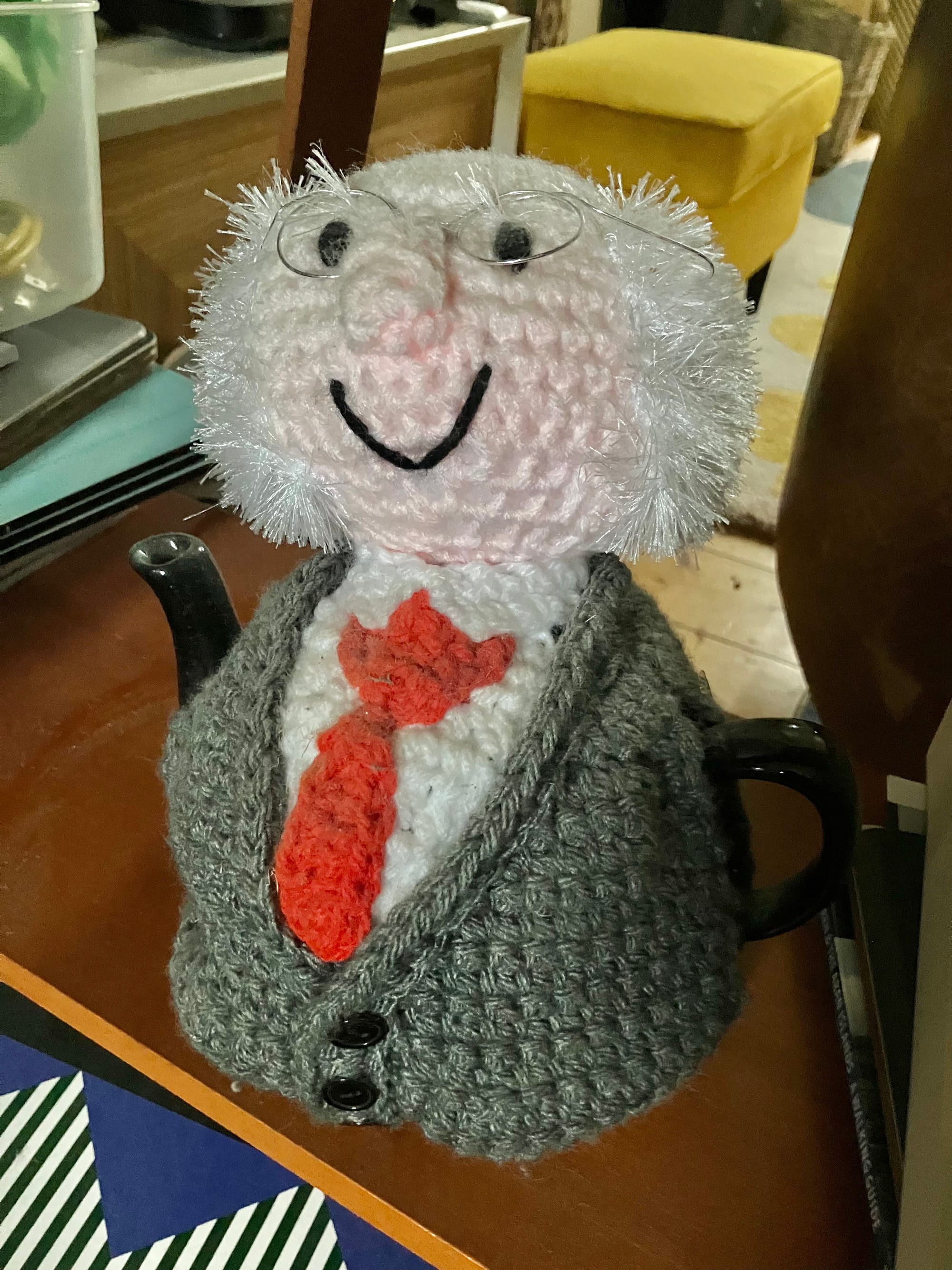 E questo stile compare ben definito anche nel copriteiera. A creare questo oggetto per noi un po' inconsueto è stata Susan Banks di Tallaght, un sobborgo di Dublino. Questa signora aveva già dimostrato la sua abilità a lavorare all'uncinetto quando aveva dato forma ad altri personaggi famosi, ma in un’intervista raccolta per un servizio di RTÉ riguardo al copriteiera presidenziale ha espresso una sintesi semplice e affettuosa che dona al manufatto un valore unico: “E’ un uomo così adorabile! E la sua altezza e la sua corporatura! E’ perfetto per un copriteiera", e lo dice appoggiando una mano sulla pelata rosa della sua creatura, ribattezzata Michael Tea e poi ripete “E’ perfetta”. Come dire, è un simbolo nazionale, ci rappresenta tutti, tiene al caldo il tè e al sicuro la nostra tradizione.